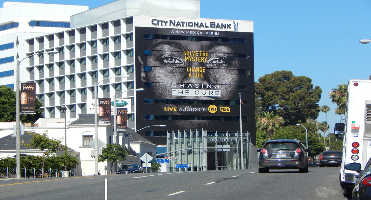 One of the best outdoor displays anywhere. On the Sunset Strip. Over 6000 sq ft with a ½ mile approach. Illumination dusk to 2am. Note partial use of windows. 15% limit for text. All creative approval by building owner and City National Bank.